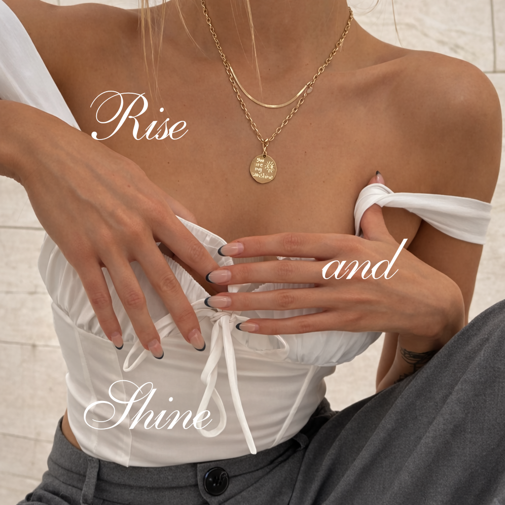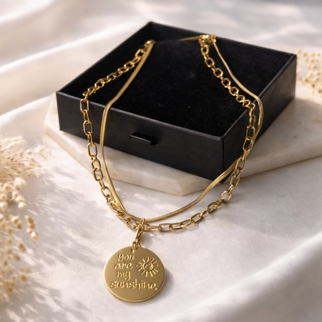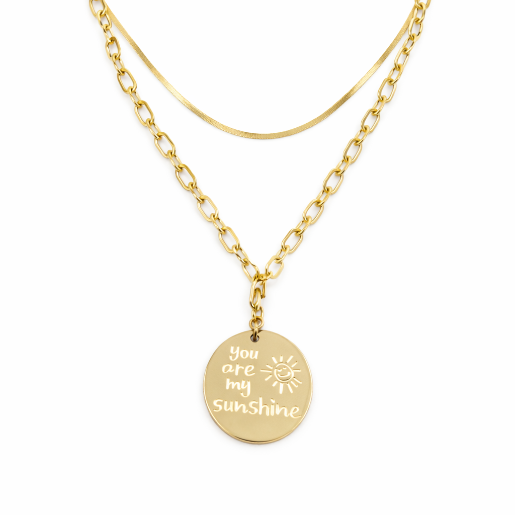 Le collier Sunshine associe une double chaîne dorée élégante à un médaillon gravé “you are my sunshine”, symbole de lumière, d’amour et d’énergie positive. Minimaliste mais puissant, il capte la lumière et attire naturellement le regard.
